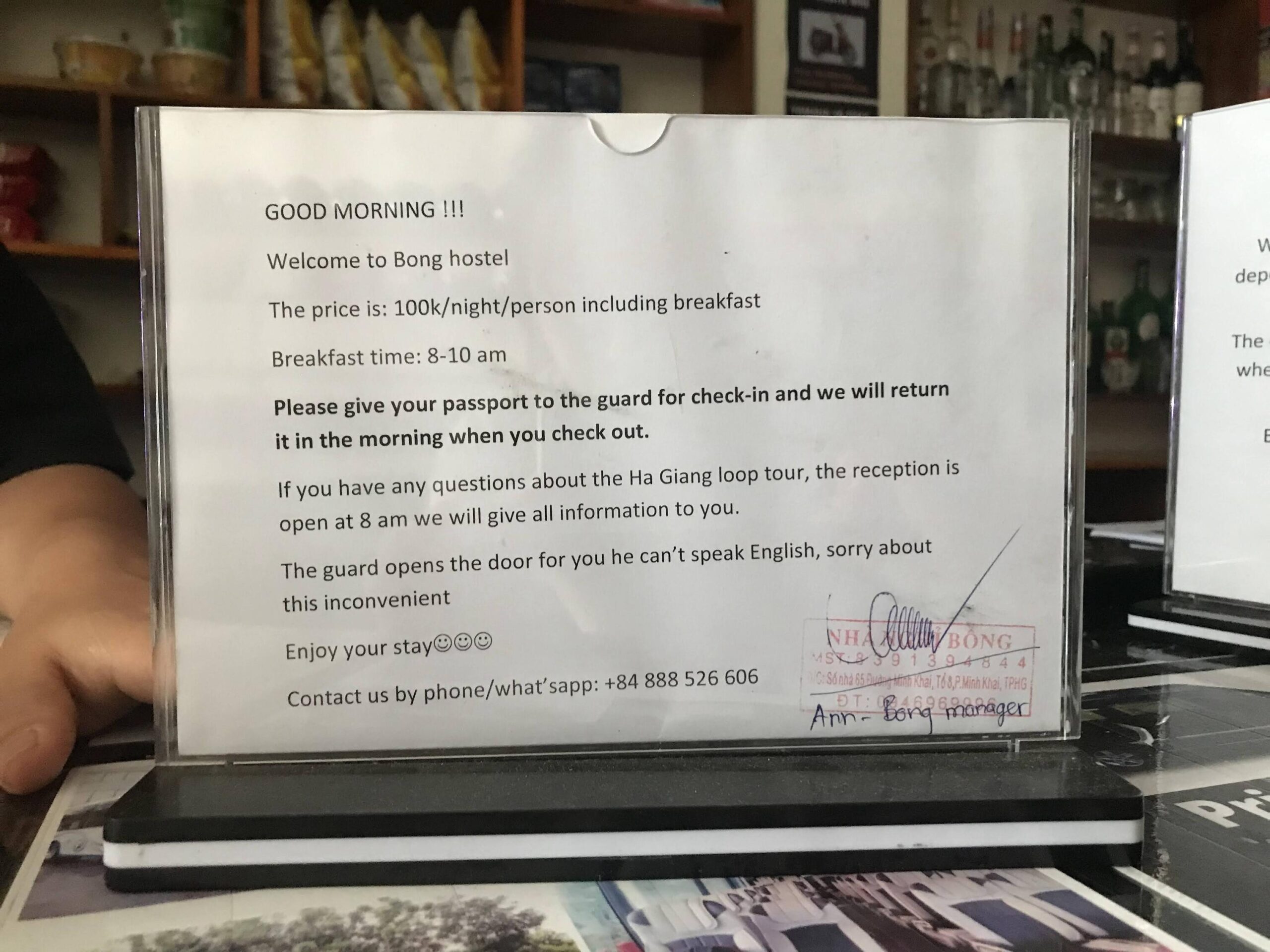 ふむふむ、「店番のお兄ちゃんは英語がしゃべれないから、詳しくは8時以降に対応しますよ。とりあえず、パスポートを預けてね。ちゃんと返すから」という案内でした。