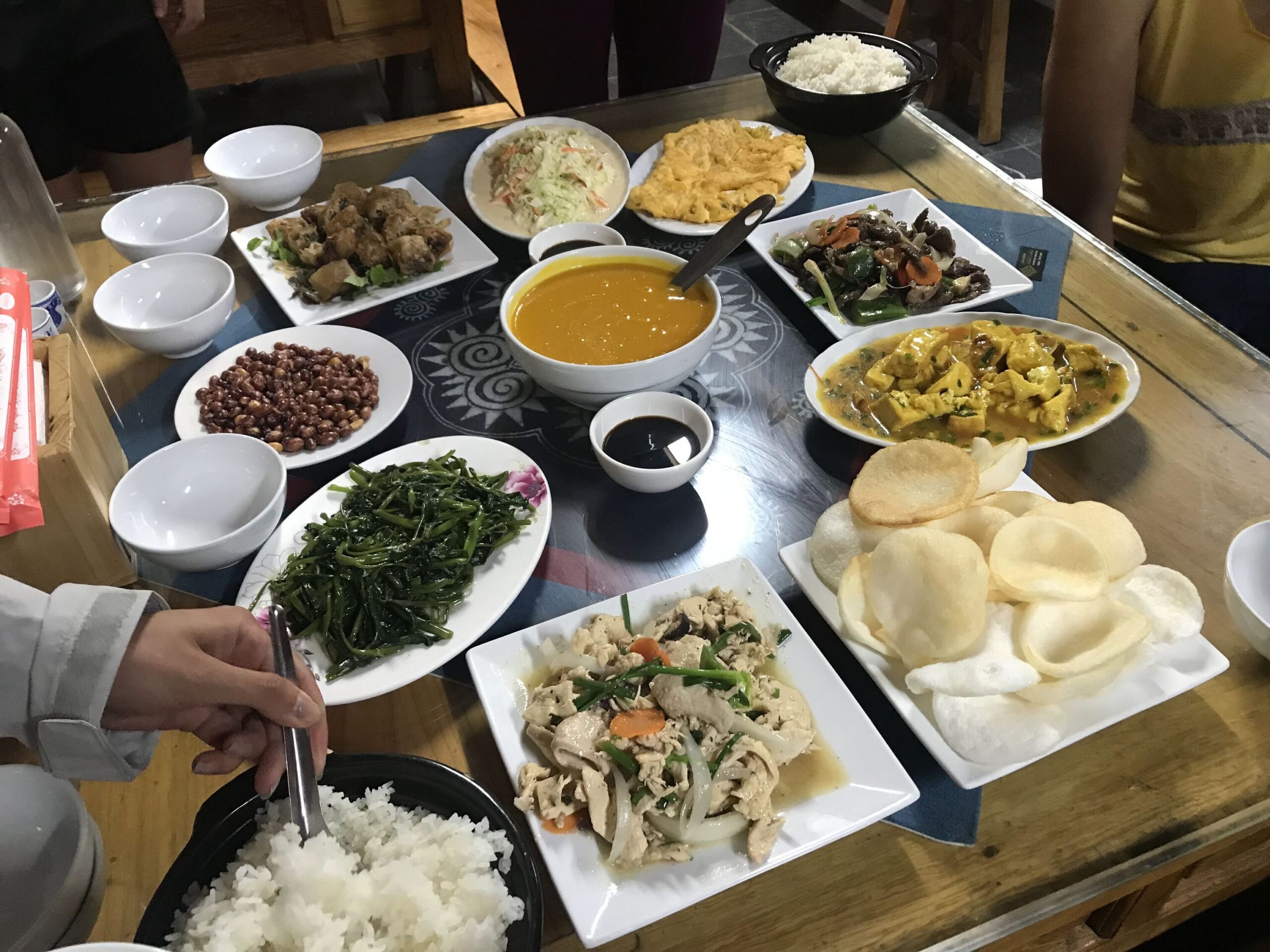 夕食はみんなで囲む形式で、ベトナムの家庭料理が並びます。