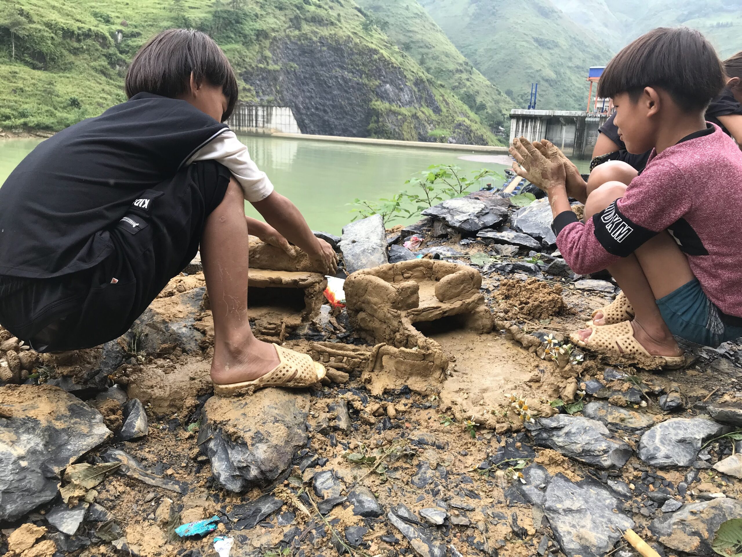 バスを降りたら徒歩で、ボート乗り場に向かうのですが、途中、何か制作中の子どもたちを発見。