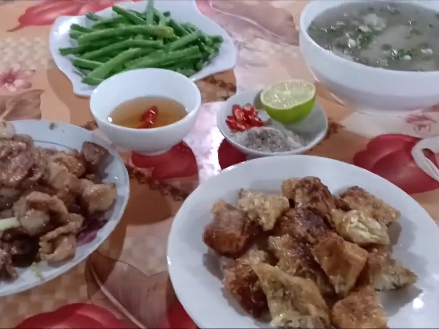 揚げ春巻き、豚肉炒め、インゲン炒め、お芋のスープ、そして白いご飯。