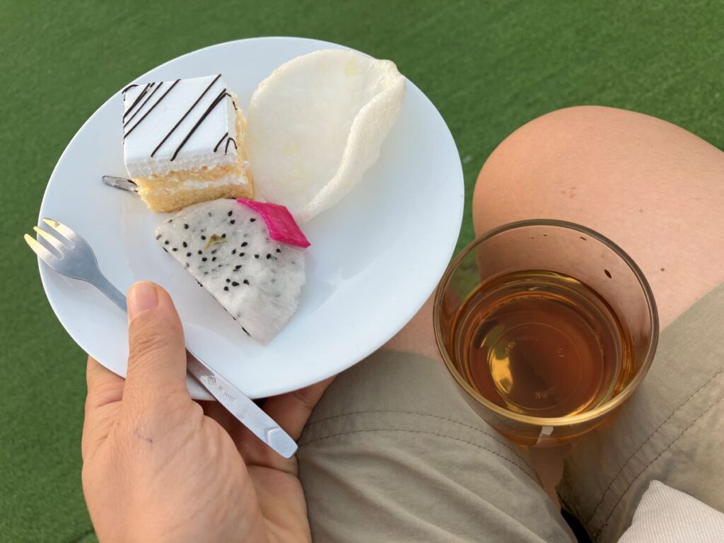デッキに上がると、サンセットパーティー用のケーキやフルーツが用意されていました。