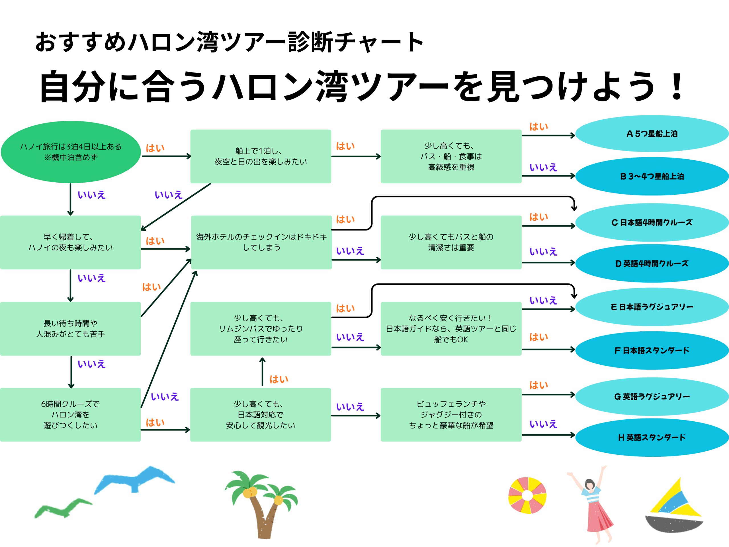 さらに、みなさんそれぞれが、自分にとっての理想のハロン湾クルーズに出会えるよう、ハロン湾ツアー診断チャートも作成しました。
