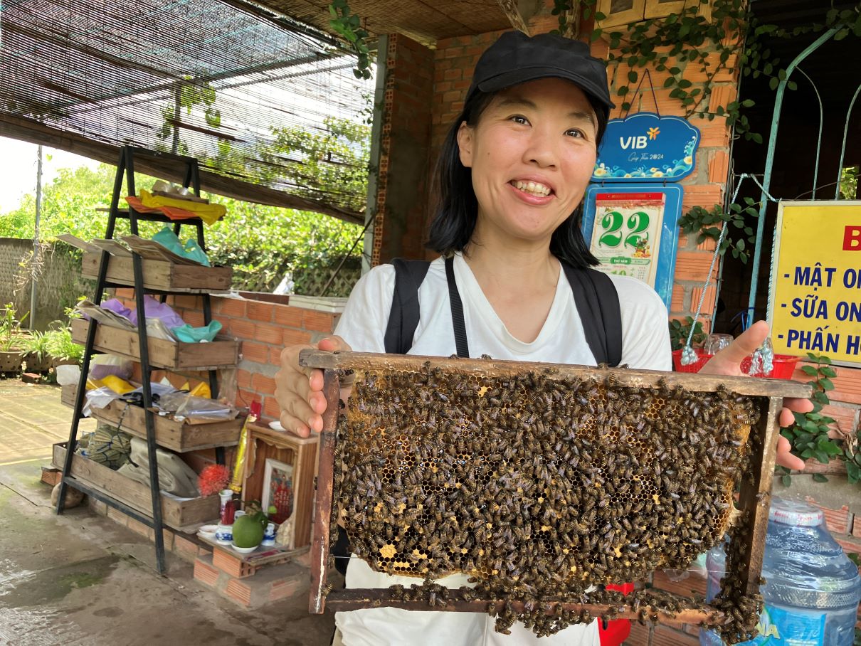 ドゥックさんの後ろで、平気な顔して巣箱を持っている、農園のお姉さんがいます。