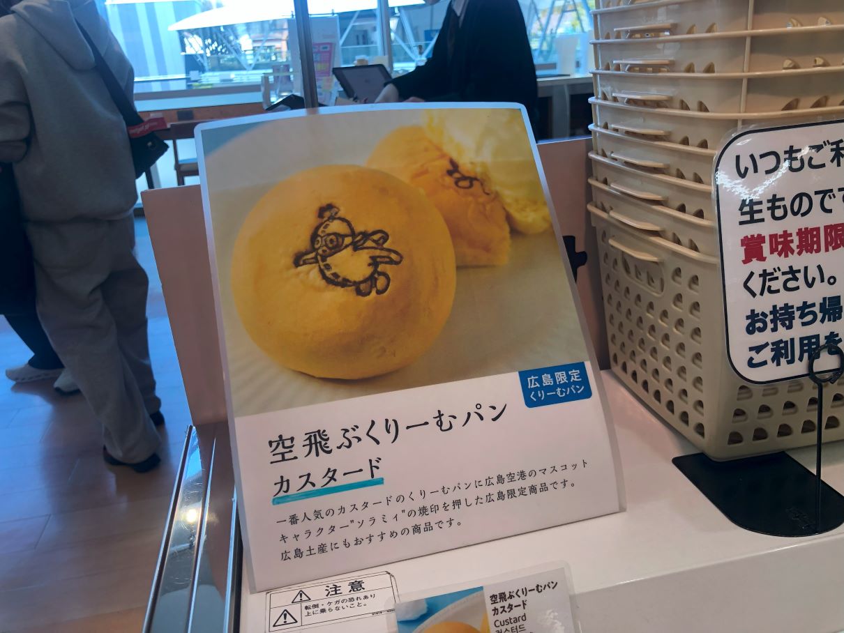 ランチ同様、迷いに迷い、八天堂の広島空港限定・空飛ぶくりーむパンにしました。通常のくりーむパンに空港のキャラクターが描かれているだけみたいなのですが、「空港限定」ということで思わず買ってしまいました。