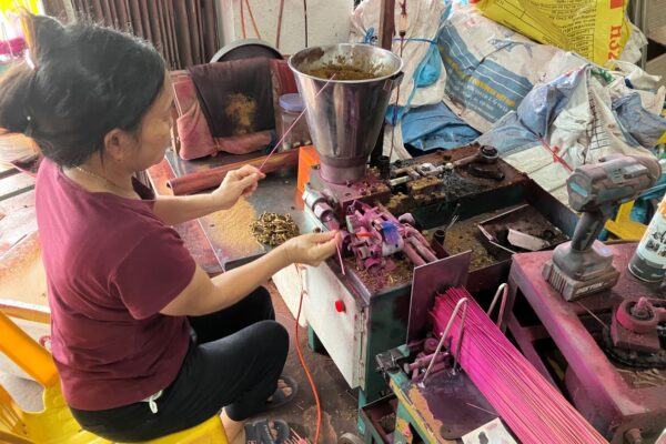 古くから線香の生産が盛んで、ベトナム全土の寺院や家庭に出荷されています。職人たちは竹を細かく割り、香料を練り込んだ粉を一本一本に巻きつけて仕上げるという伝統的な製法を守り続けています。